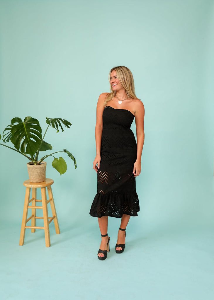 This strapless dress features a flirty ruffle bottom and intricate eyelet detailing.
