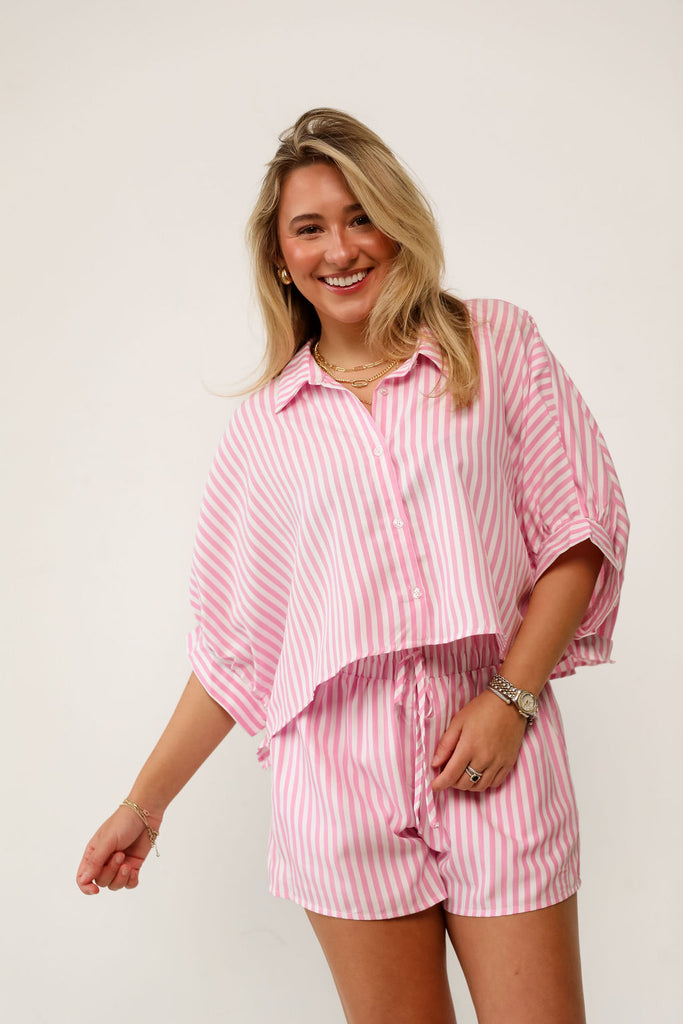 A stylish and versatile option! Made from a striped fabric, this set includes a button down crop top with a collar neckline and matching shorts. Available in three color options.