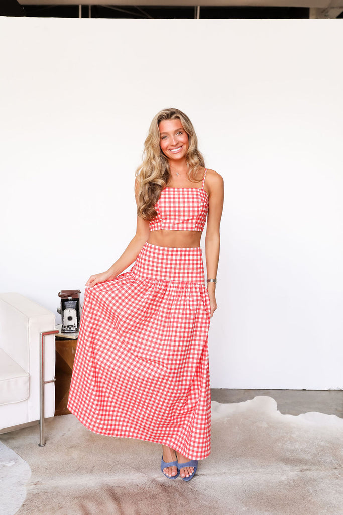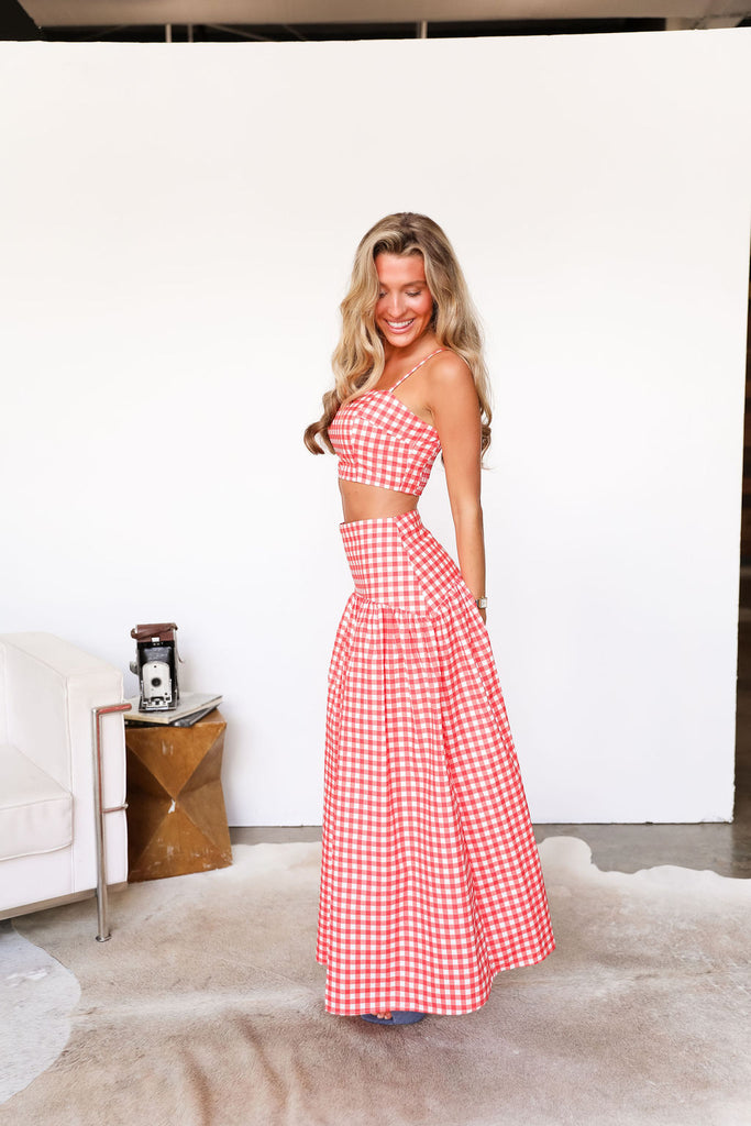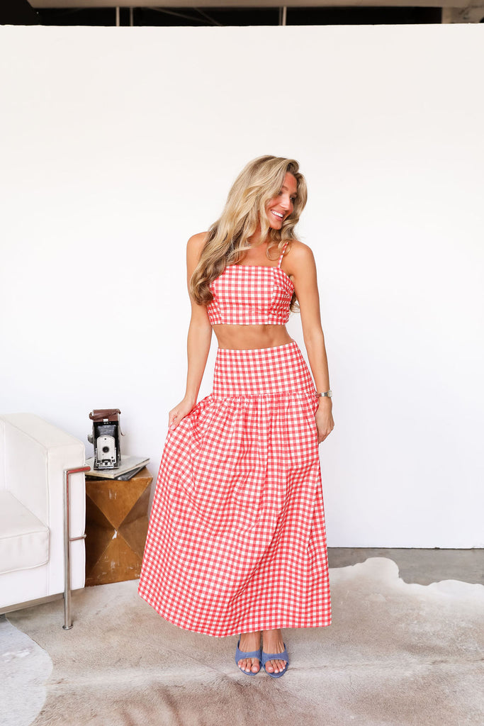 Featuring a chic crop top paired with a matching maxi skirt. The delicate red gingham offers a timeless, elegant look perfect for day-to-night occasions.