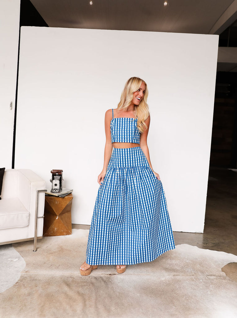 Featuring a chic crop top paired with a matching maxi skirt. The delicate blue gingham offers a timeless, elegant look perfect for day-to-night occasions.