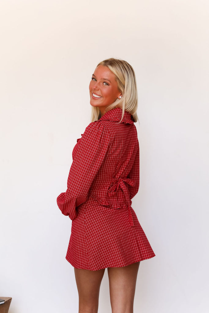 This long sleeve dress features a v neck and a unique clasp front closure, creating a flattering silhouette. This dress offers a collar detail and corset style top.