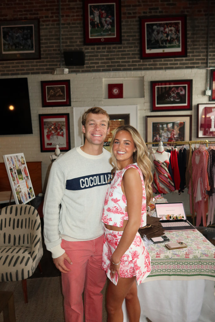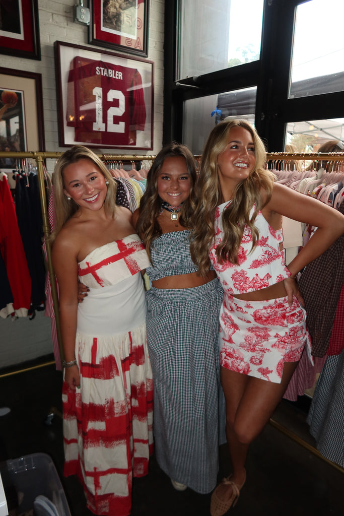 This high neck sleeve top and matching mini skirt feature eye-catching toile print and intricate design.