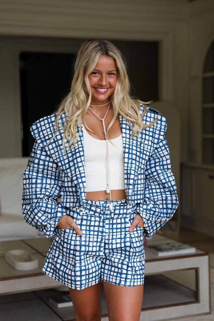 Playful meets polished in this ivory and blue plaid matching set, featuring tailored belted shorts, an exaggerated collar, long sleeve cropped jacket . Equal parts cozy and chic, this look is made for effortless standout style.