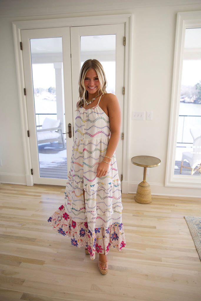 Featuring intricate stitching patterns and a stunning floral ruffle bottom and detail. Adjustable straps ensure a perfect fit. A unique design and the perfect dress for your next special occasion!