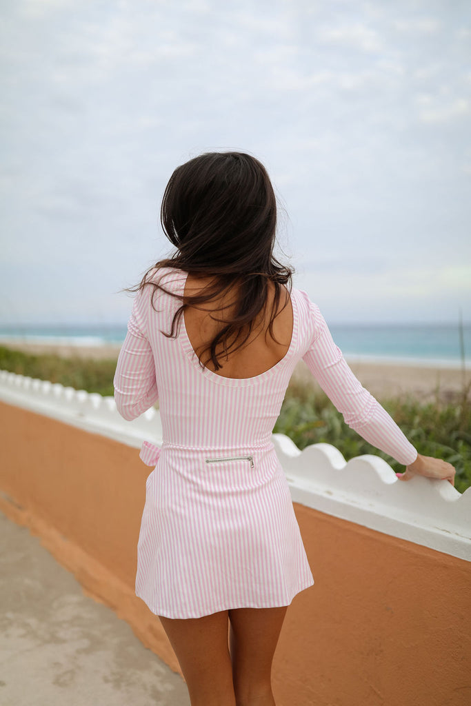 This one of a kind dress/romper silhouette is both fitted and super soft, giving you comfort and style in one. The lightweight and smooth fabrication will keep you feeling cool; long sleeve, scoop back detail. Plus, the sarong detail and zipper back pocket add a unique design.