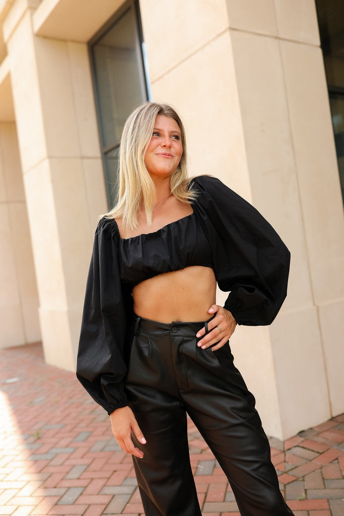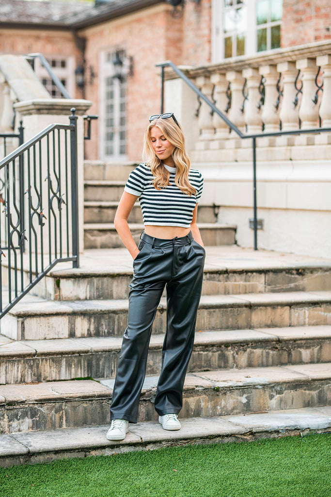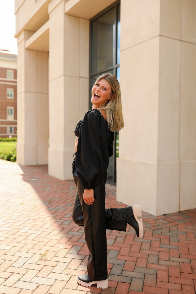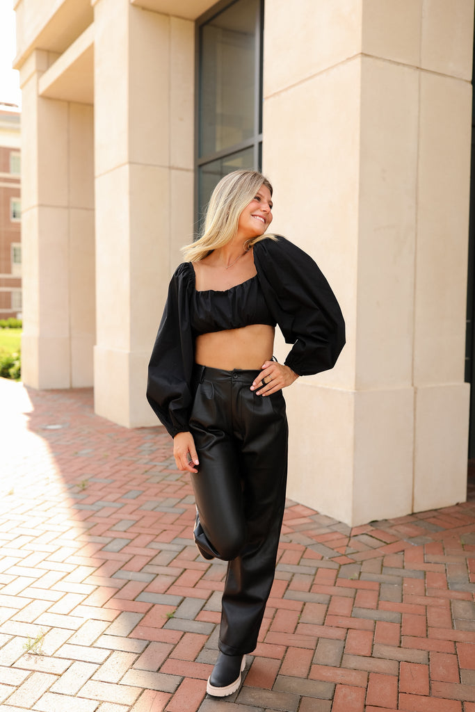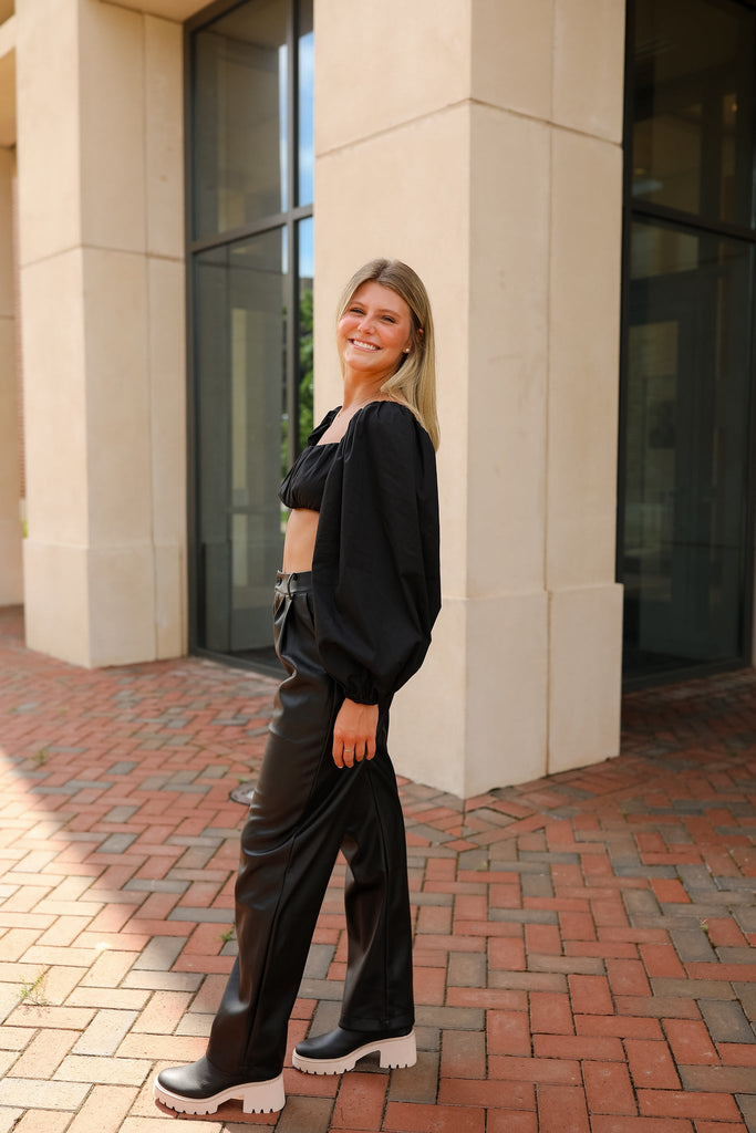 - high waisted black pu leather pants with zipper closure and front button closure featured in an incredible butter soft leather. We recommend spot clean only.