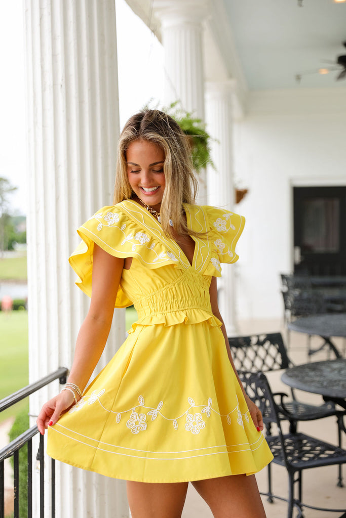 This mini dress features a v-neck and elegant flutter sleeves. The smocked bodice creates a tailored silhouette while delicate floral details add refined charm. Available in multiple colors.