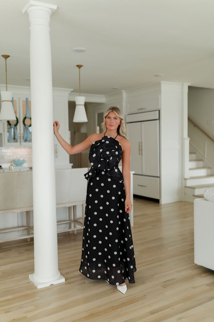 A backless maxi dress featuring statement ruffle detailing at the bust and side , features adjustable criss-cross back straps.