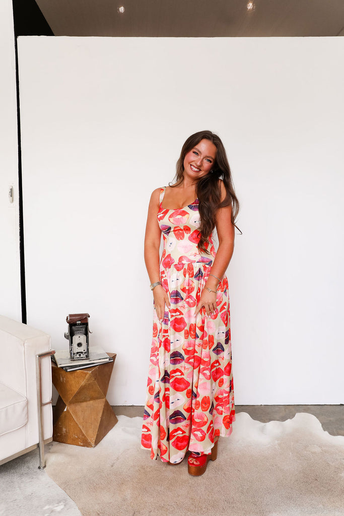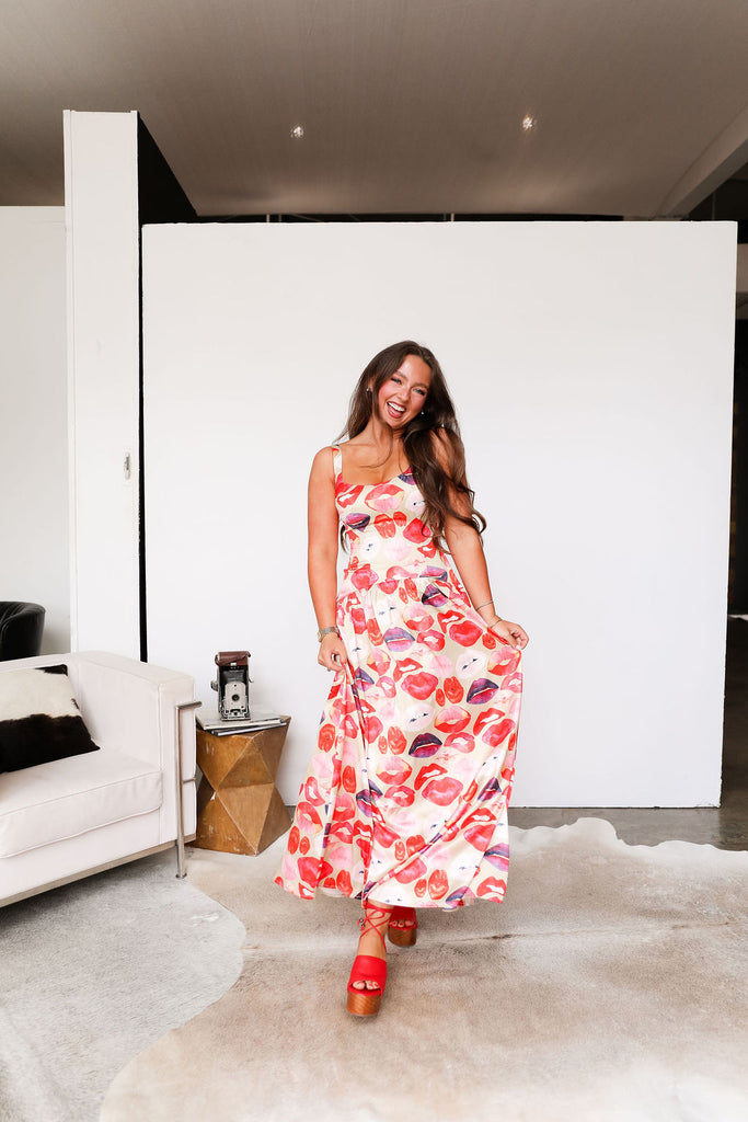 Make a bold statement in this playful drop waist maxi dress, featuring an all-over lip print and a flattering, flowy silhouette.