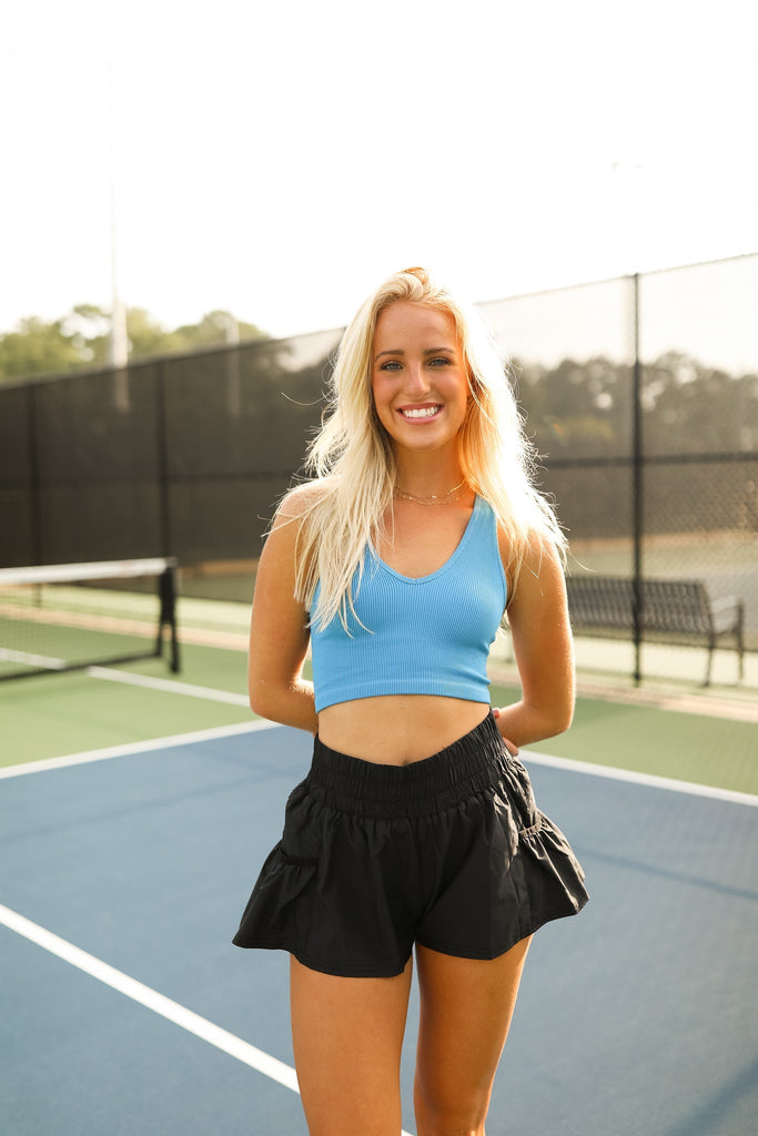 Meditate or make a move in this ribbed compression fit crop featuring a V-neck racerback design that keeps you feeling secure as you work out. Can be worn with or without a bra for extra support. With a formfitting silhouette and stretch fit.