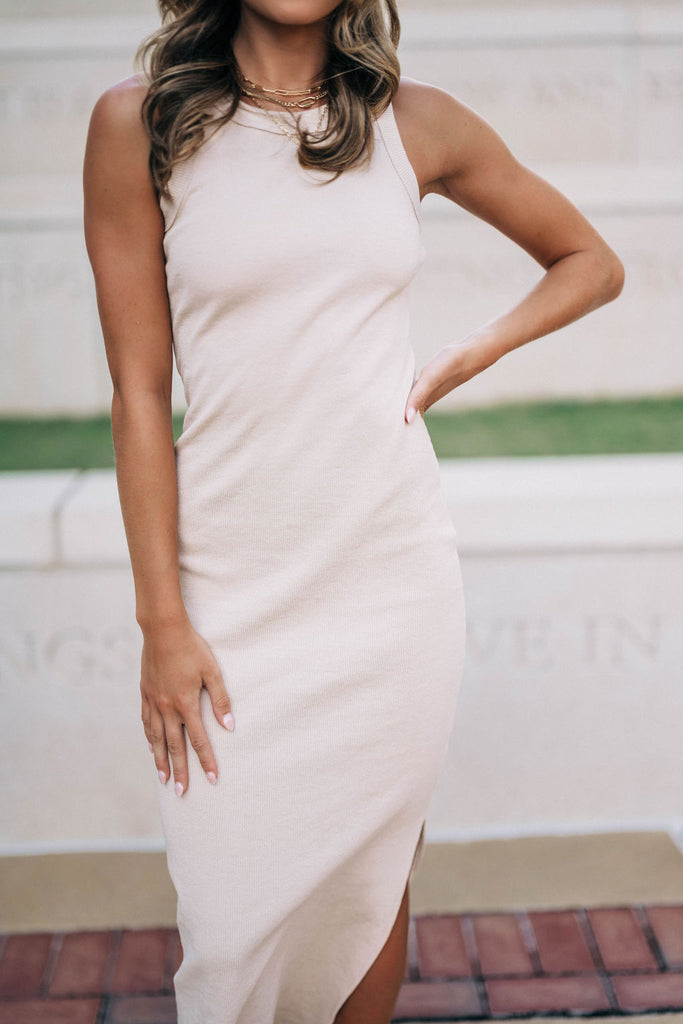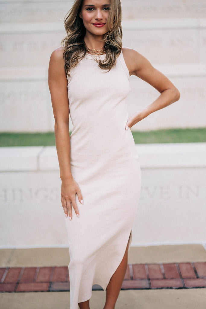 Cotton knit sleeveless maxi dress in a bodycon style. Flattering tight fit midi perfect for summer!