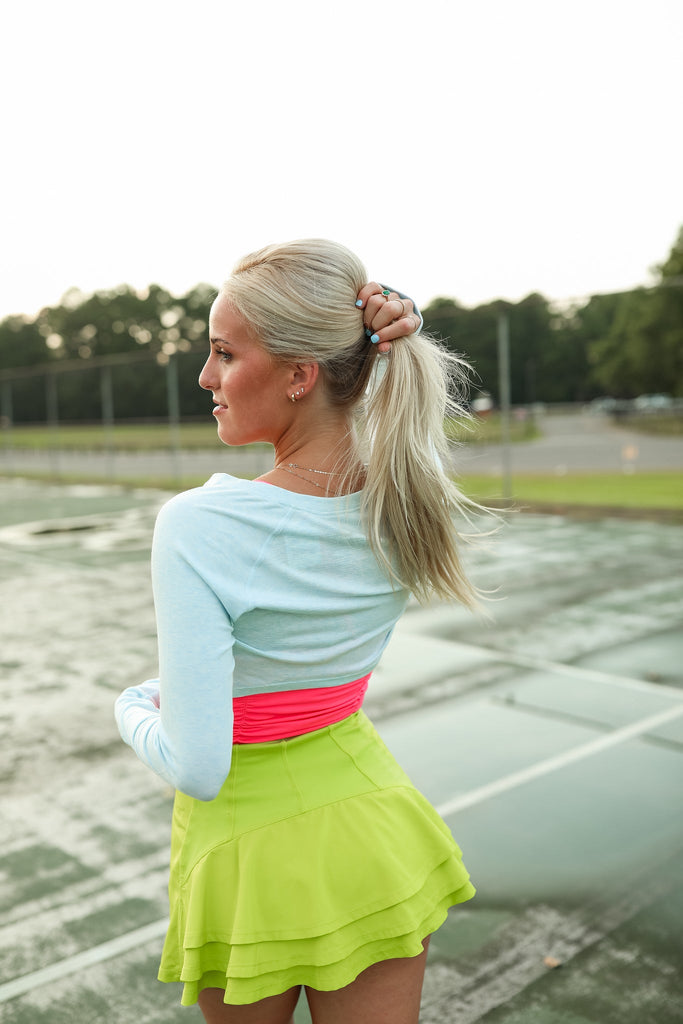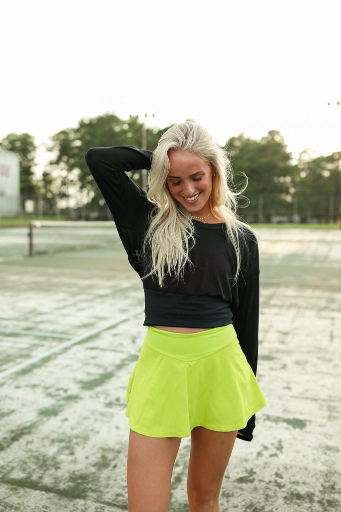Call it love in this so fine tennis score featuring a flirty ruffled skirt with a fitted high-rise waistband over peekaboo fitted shorts with a side pocket for your tennis balls. Pull on style. Voluminous back detail. Stretch fit shorts. Machine wash cold.